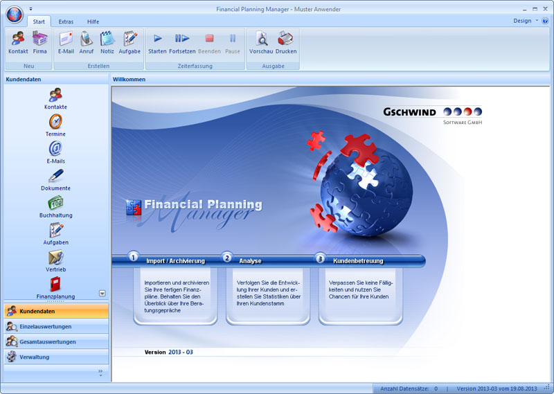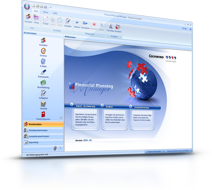 Der GSCHWIND Financial Planning Manager ist ein CRM-System mit hinterlegter Datenbanklösung. Das Tool ermöglicht Ihnen Ihre Kundendaten aus der Finanzplanung optimal zu verwalten und auszuwerten. Über die Zuführung relevanter Anlegerinformationen zu einem Archiv hinaus hilft Ihnen die Software bei der Gestaltung von Kundenbeziehungen.